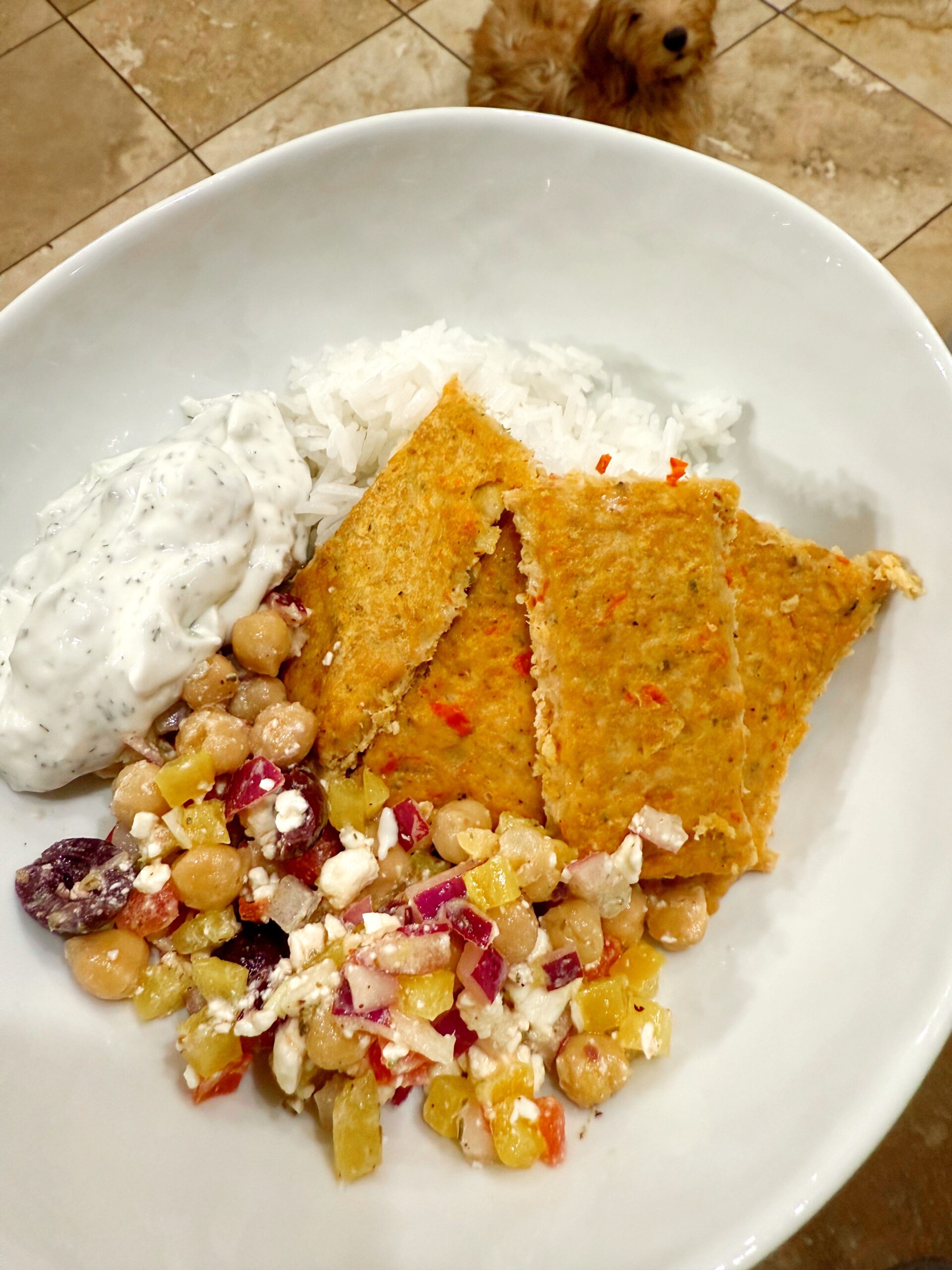 This Kale Junkie recipe was a 10/10. The kids loved it, too! I served it with tzatziki and chopped salad (the cucumbers were bad so I skipped them) and pita bread for Liv and the Pilot, and Coyotas tortillas for P and me.