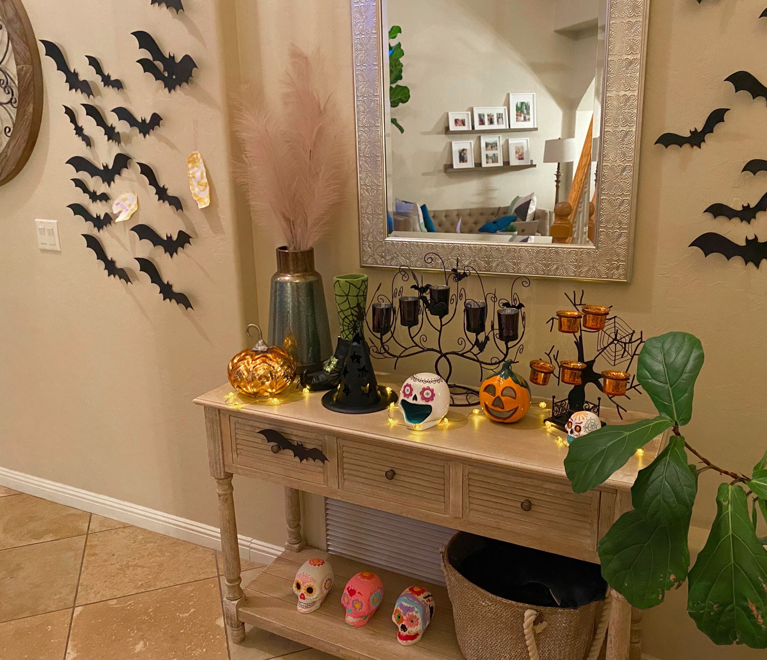 (Halloween decor is up! We didn’t go too wild but we have Jack and Sally in the window, our usual pumpkin displays, and our little Halloween table)