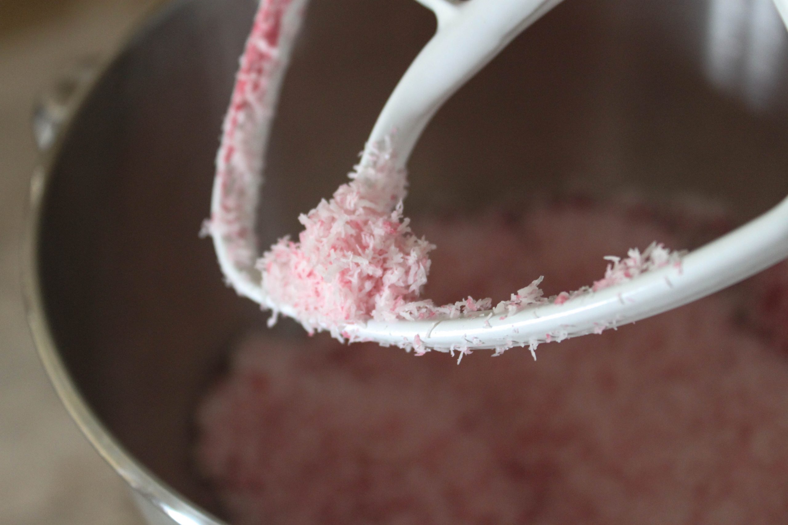 1. Mix all of the dry ingredients in a mixer, and then add the beet juice. Mix around until the mixture is a light pink color.